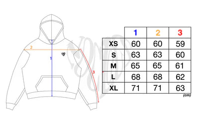 This hoodie has a boxy fit — wide and slightly cropped. Please refer to the measurements below.